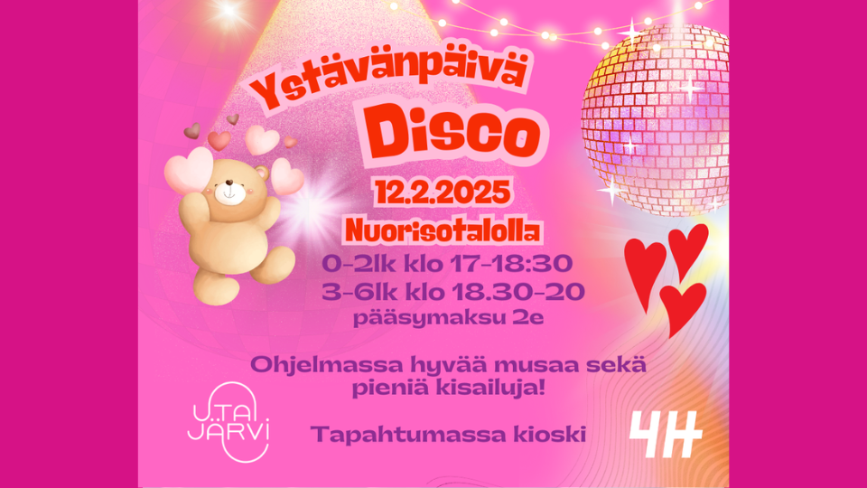 Ystävän päivän disco nuokkarilla12.02.2025 17:00 - 20:00Julkaistu 12.02.2025 Keskiviikkona 12.2. Nuoriso- ja liikuntatalolla 0.–2.lk 17-18:30 3.–6.lk 18:30–20 Pääsymaksu tapahtumaan 2e (eskarilaisten huoltajille maksuton) Luvassa hyvää musaa ja pieniä kisailuja. Tapahtumassa palvelee kioski. Tervetuloa discoilemaan!